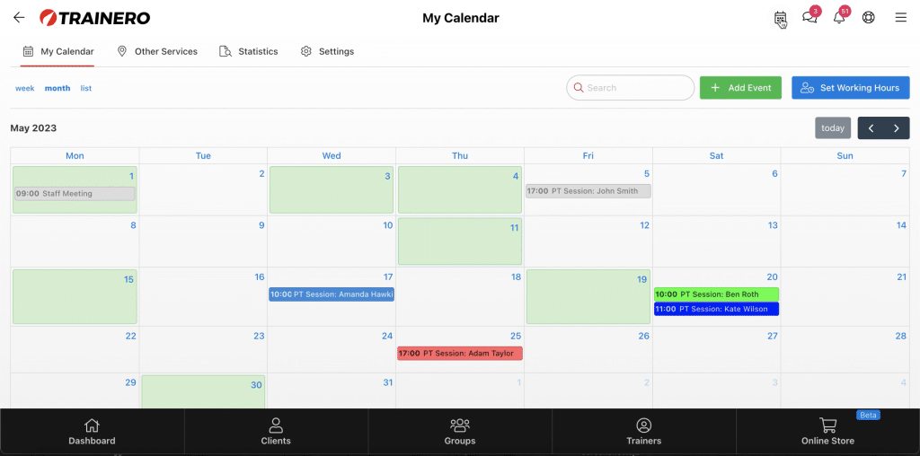 - Statistiche del calendario: Visualizza i dati storici delle prenotazioni per qualsiasi trainer, inclusi i riepiloghi delle presenze per mese — o ricevi automaticamente un riepilogo giornaliero via email